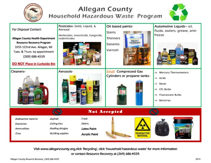 Allegan County is hosting a drive-through Household Hazardous Waste and E-Waste Collection. Simply bring your items to the drop-off site, and volunteers will unload and sort them directly from your vehicle.